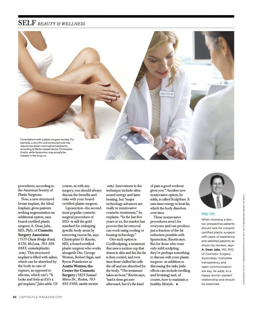 Now, a new structured breast implant, the Ideal Implant, gives patients seeking augmentation an additional option, says board-certified plastic surgeon A. Dean Jabs, MD, phD, of Cosmetic Surgery Associates (1515 Chain Bridge Road, #310, McLean, 703-506-0683; cosmeticplastics.com). This structured implant is filled with saline, which can be absorbed by the body in case of rupture, as oppose to silicone, which can’t. “It looks and feels as if it’s a gel implant,” Jabs adds. Of course, as with any surgery, you should always discuss the benefits and risks with your board-certified plastic surgeon.