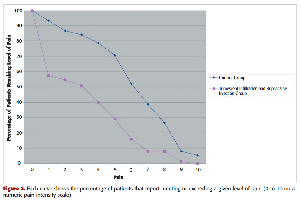 A retrospective chart review of 150 primary submuscular augmentation mammaplasties performed by 2 surgeons was conducted. Seventy-five consecutive augmentations performed by each physician during the same time period were studied. One surgeon used tumescent infiltration, using a syringe and a blunt infiltration cannula, placing 50 mL of standard tumescent solution in the planned pocket area of each breast before dissection. In addition, all cut muscle ends were injected with 0.25% bupivacaine with epinephrine (1:100,000, 40 mL per patient) under direct vision. The other surgeon omitted these steps. Patients evaluated pain subjectively using a 0 to 10 numeric pain intensity scale reported to the recovery room staff at specific times in the postanesthetic care unit.