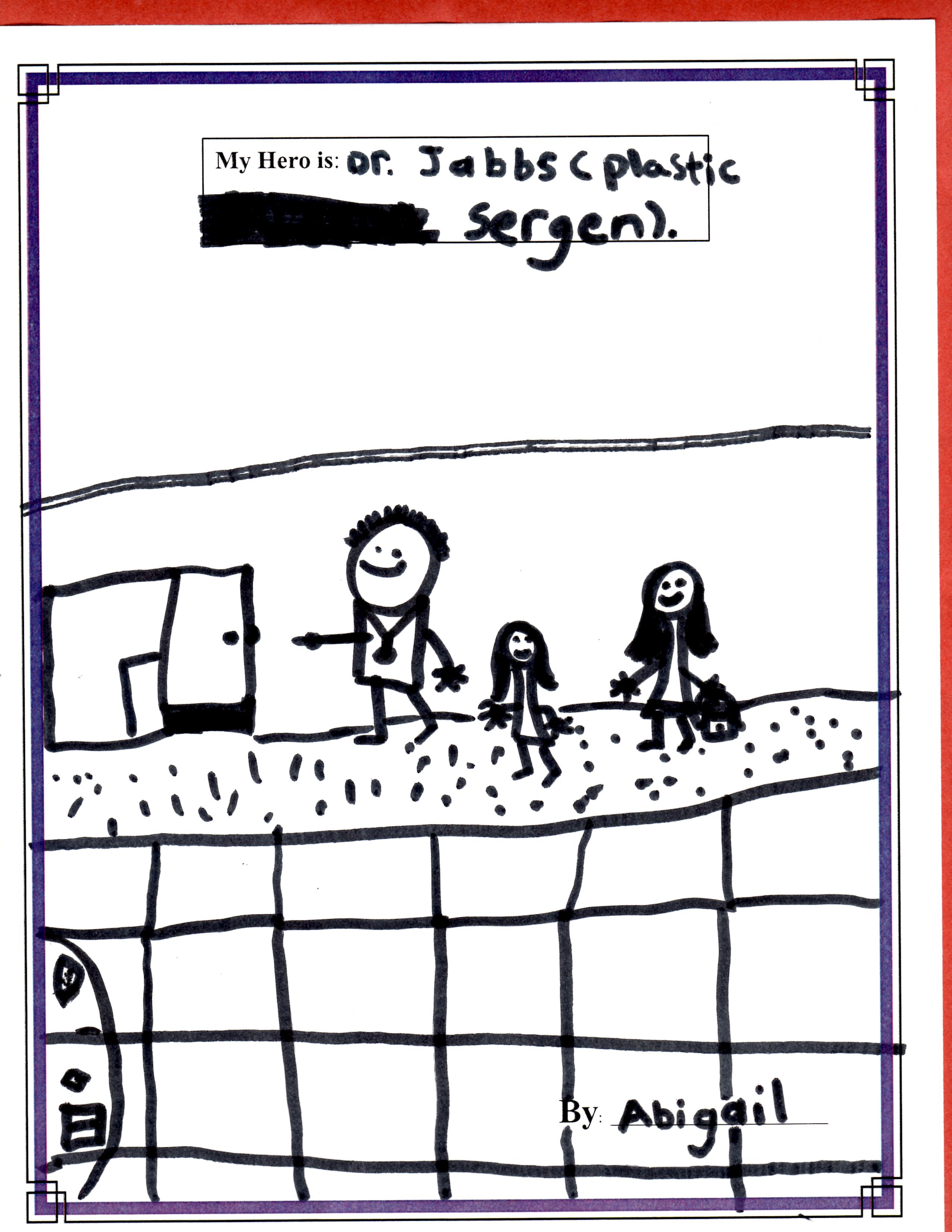 I just wanted to pass along a drawing that our daughter Abby made not too long ago at her Sunday school class where she was told to draw a picture of her hero. She is doing great, now having just turned 7, and we are coming up on her two year dog bite-aversary. We had a little celebration on the one-year, a year ago, and we will again this year, so thankful that she looks so good and that we were lucky to have you help us on that horrible day. Thank you again. You are our hero as well.